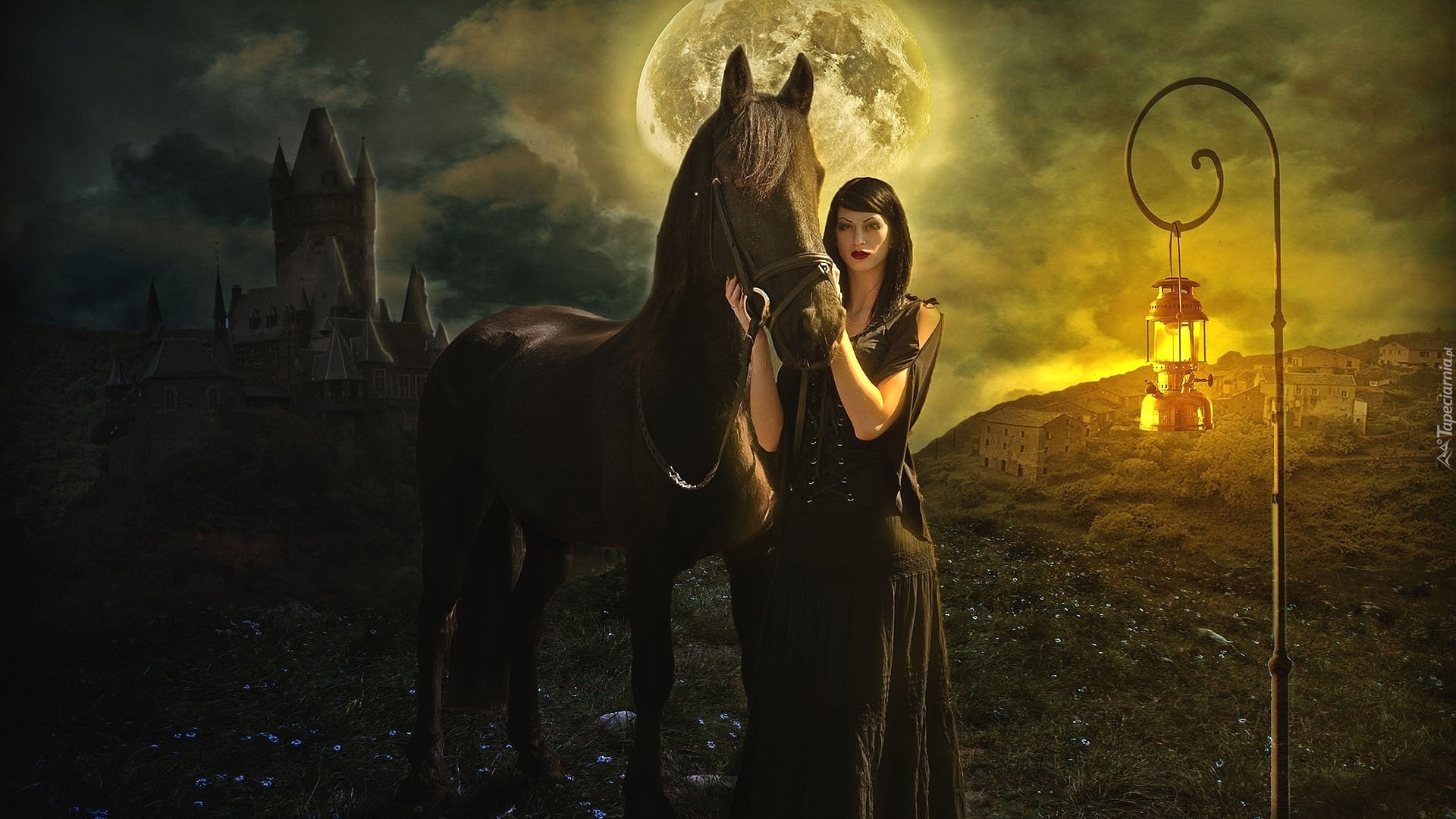 Edytor tapety: Fantasy, Brunetka, Koń, Domy, Zamek, Księżyc, Lampa