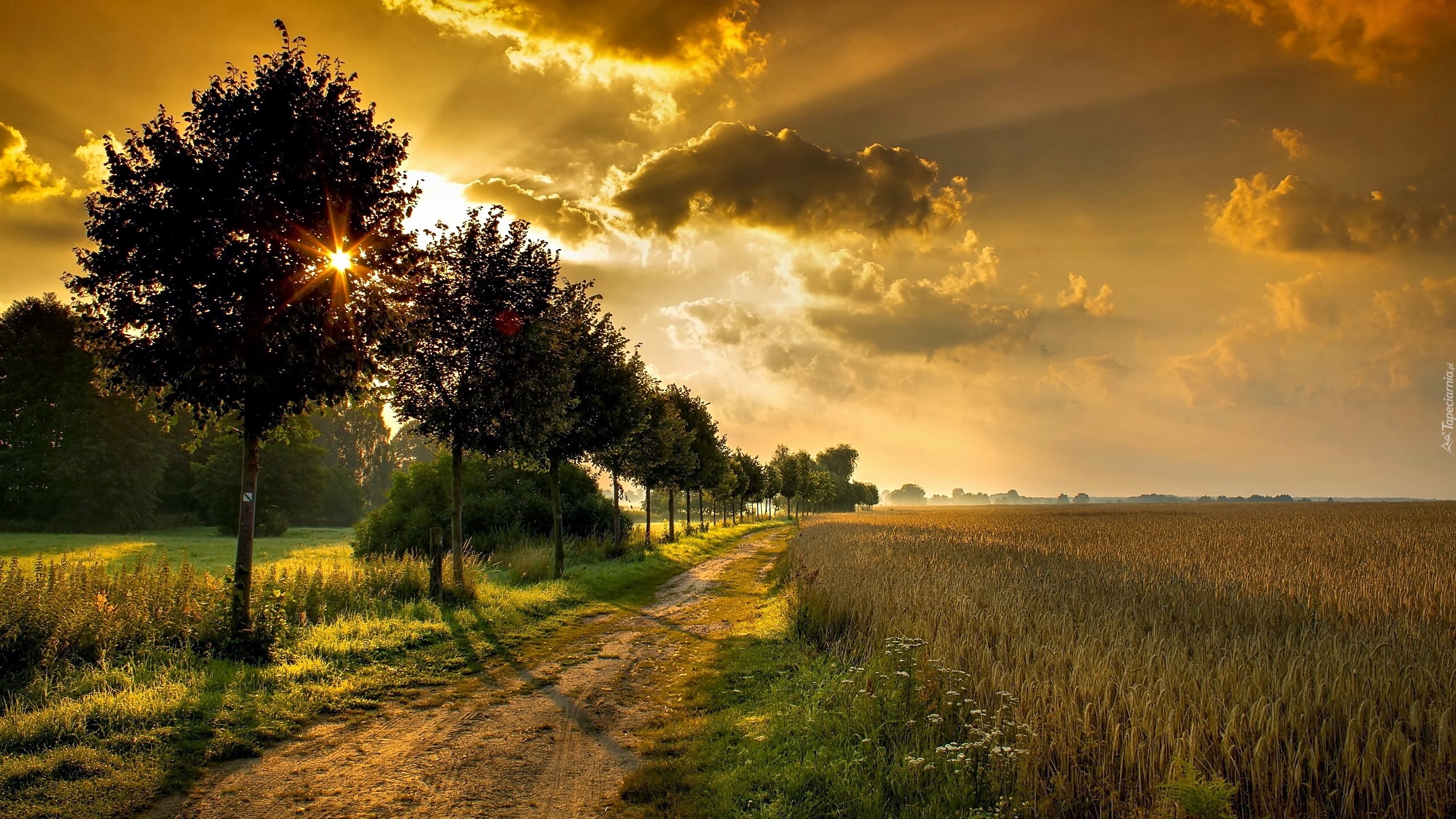 Edytor tapety: Drzewa, Droga, Pole, Chmury, Promienie, Słońca