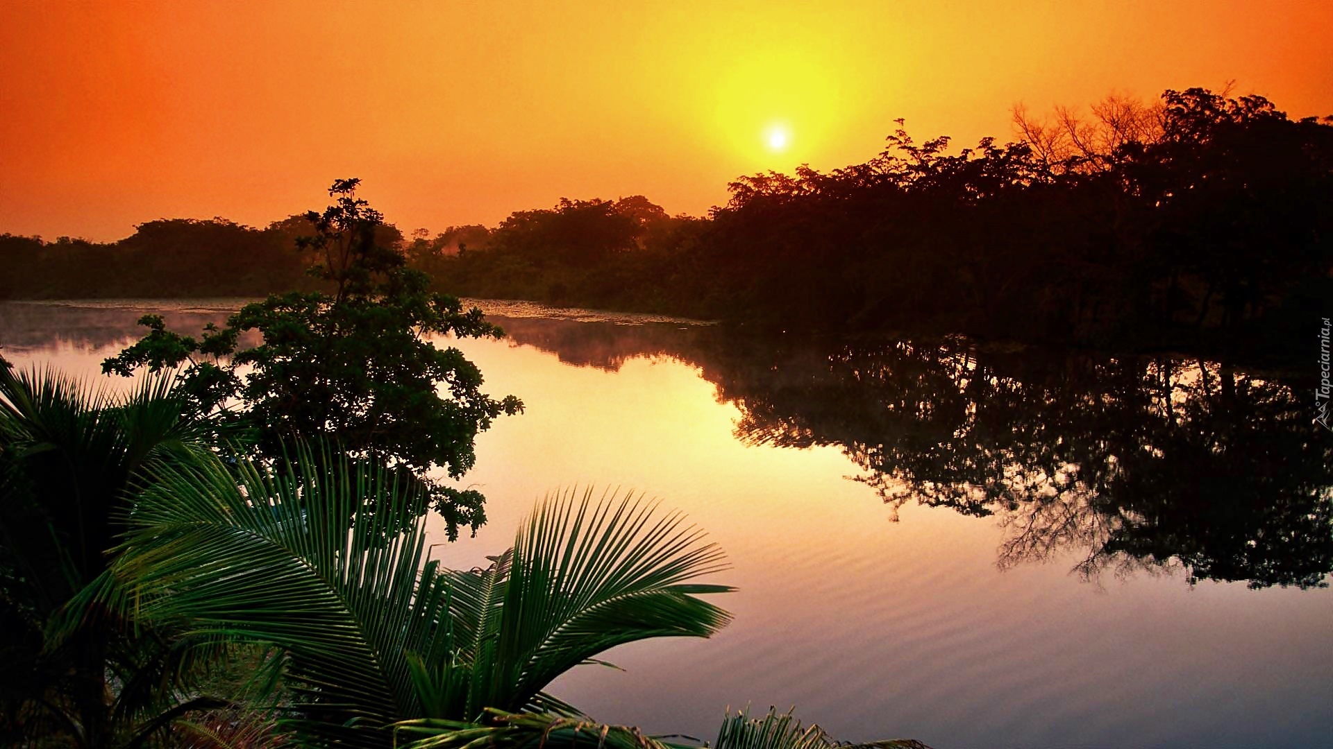Edytor tapety: Rzeka, Drzewa, Zachód, Słońca, Odbicie