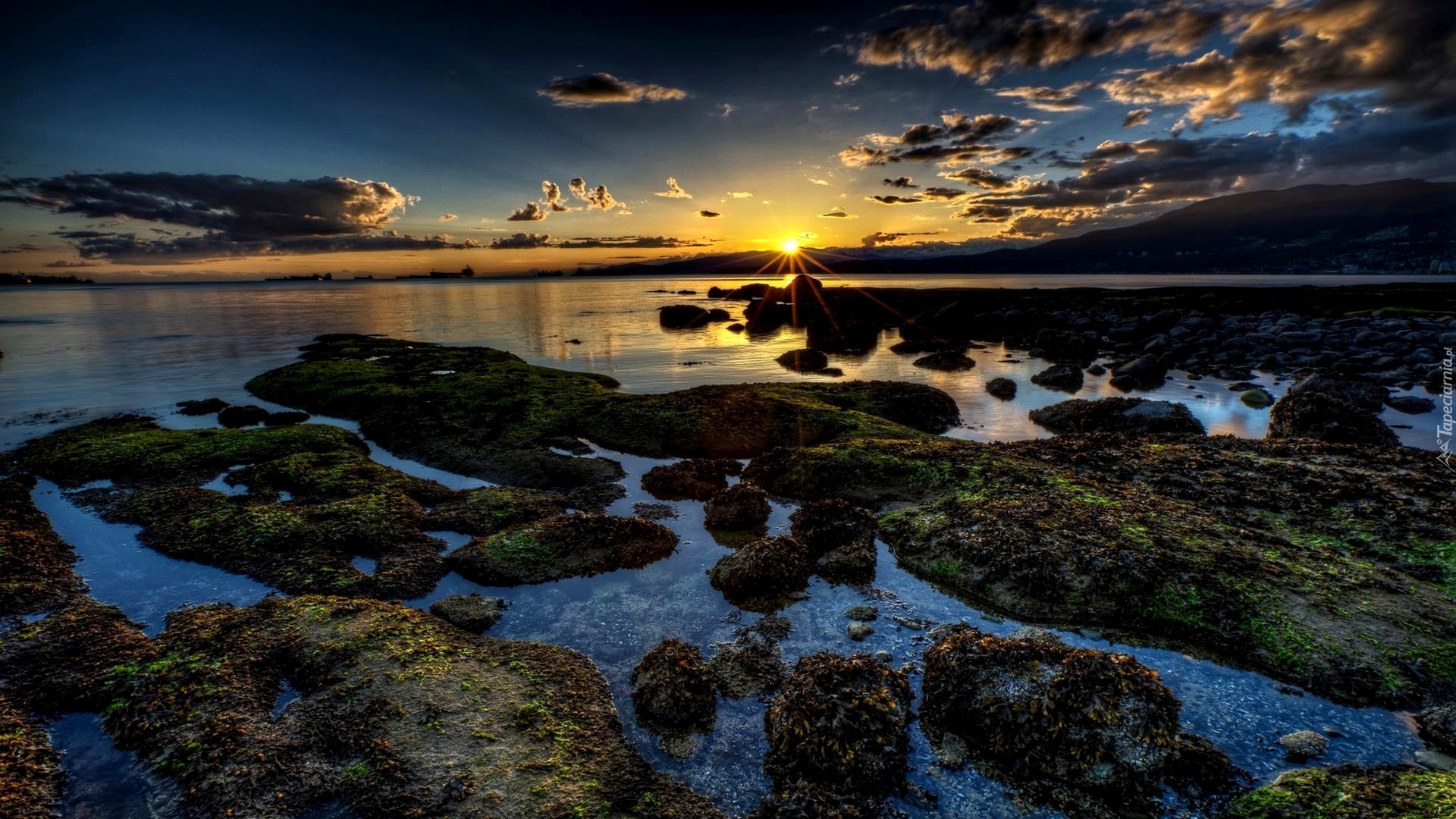 Edytor tapety: Jezioro, Omszałe, Kamienie, Promienie, Zachód słońca