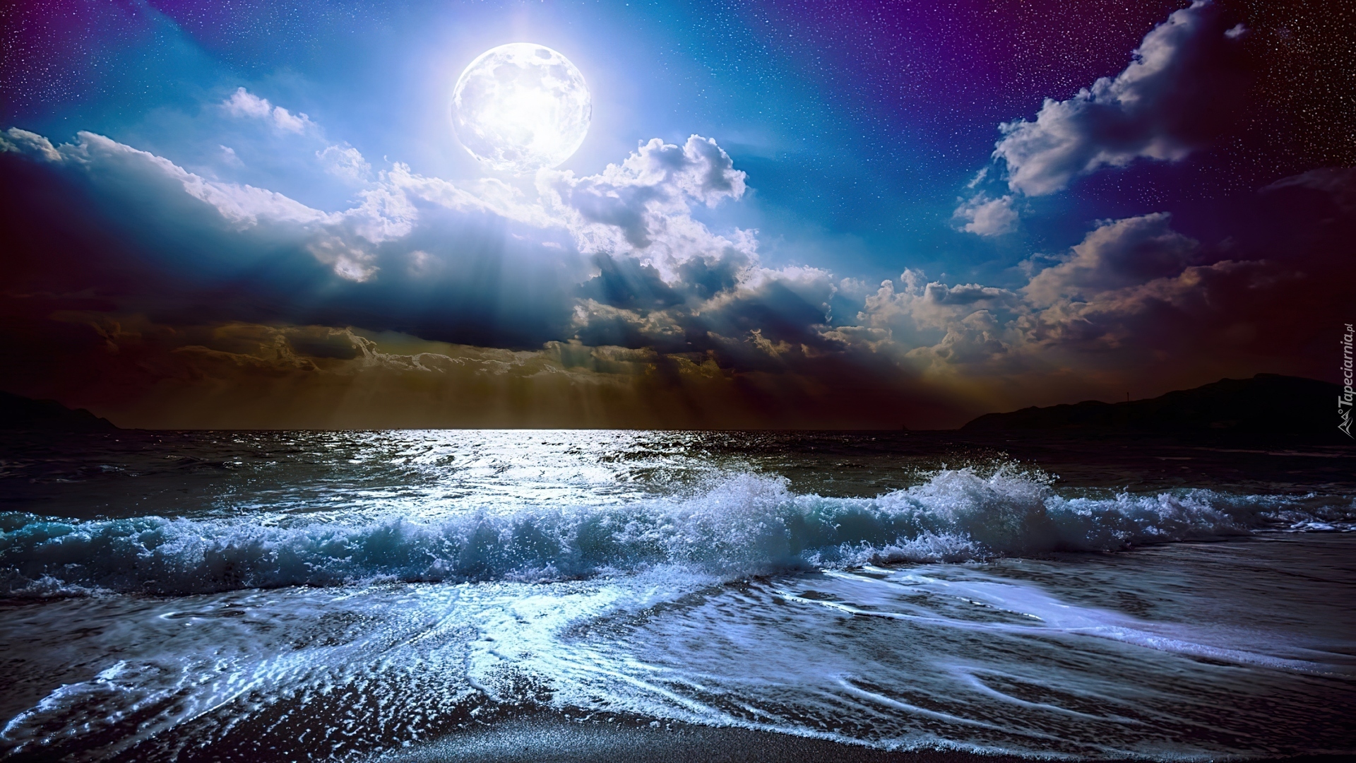 Edytor tapety: Morze, Noc, Fale, Księżyc