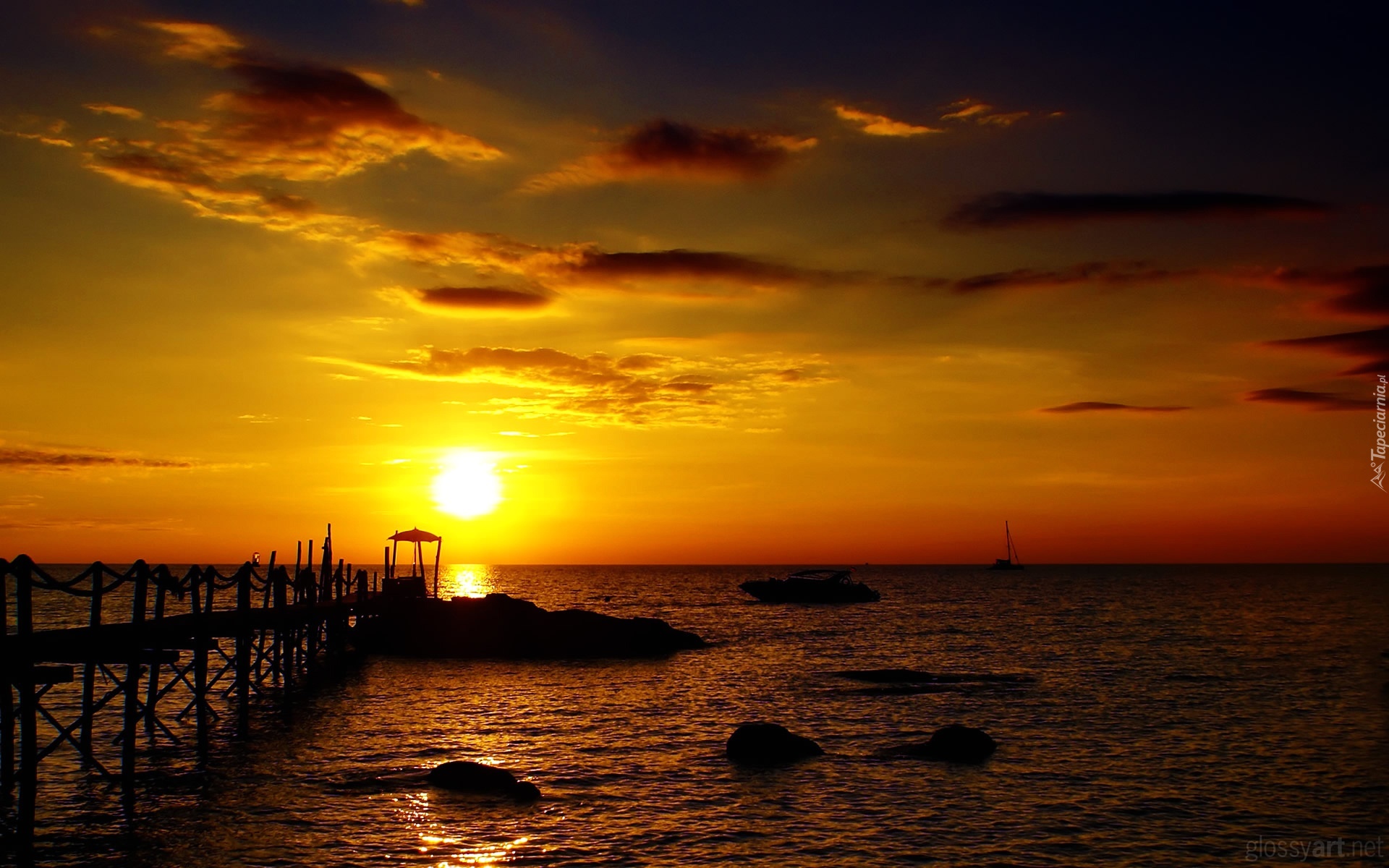 Edytor tapety: Morze, Molo, Niebo, Chmury, Zachod, Slonca