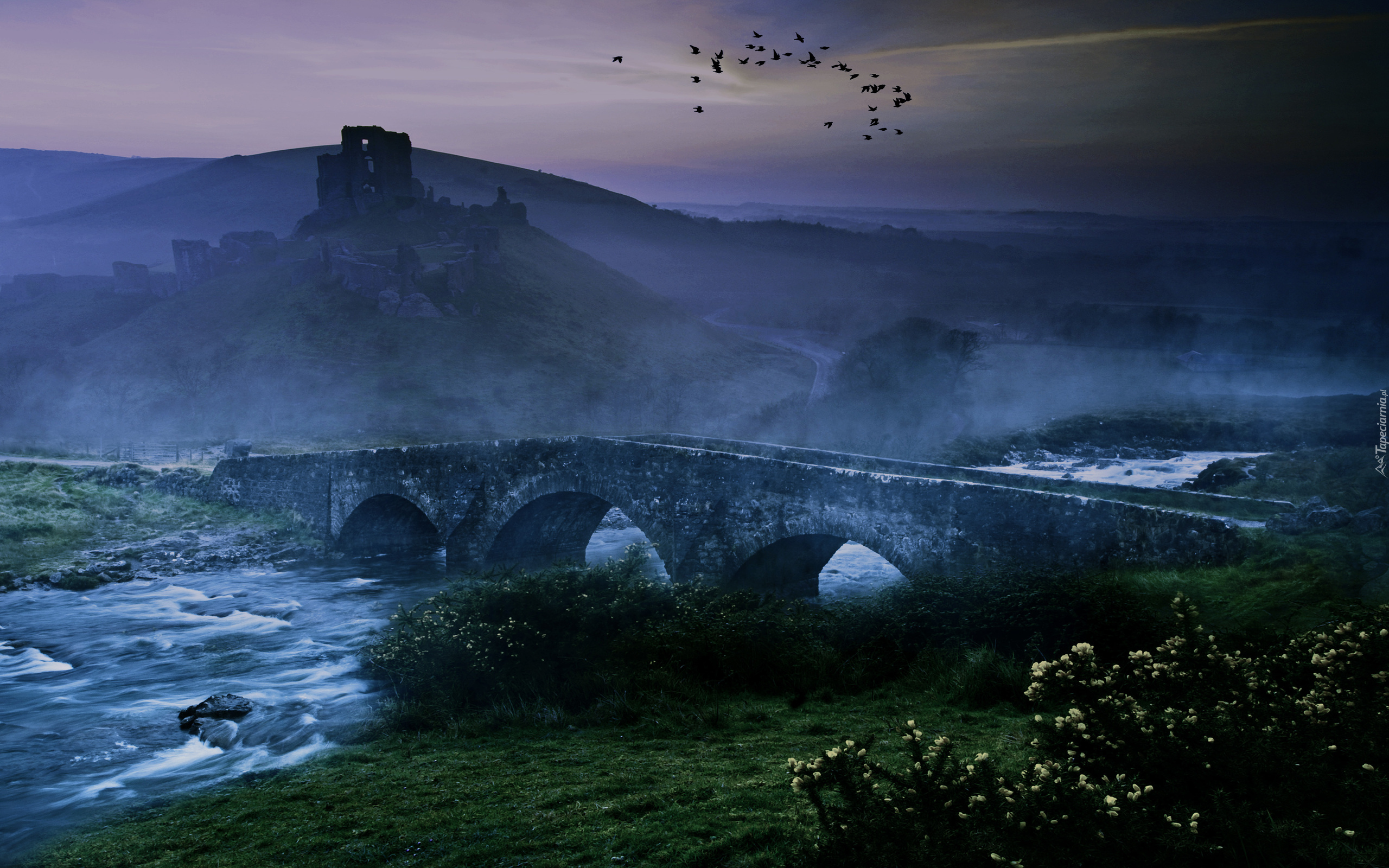 Edytor tapety: Ruiny, Most, Rzeka, Mgła, Ptaki, Rośliny