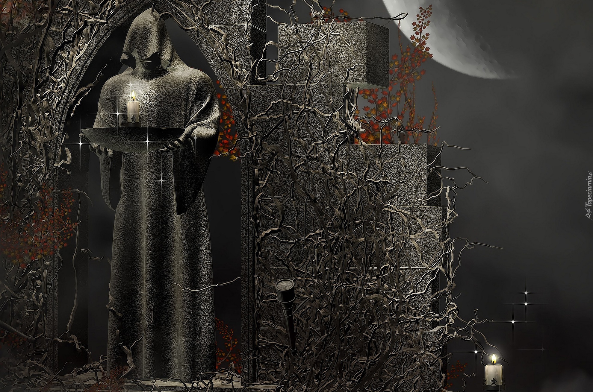 Edytor tapety: Fantasy, Mnich, Postaci, Świece, Mur, Pnące, Rośliny