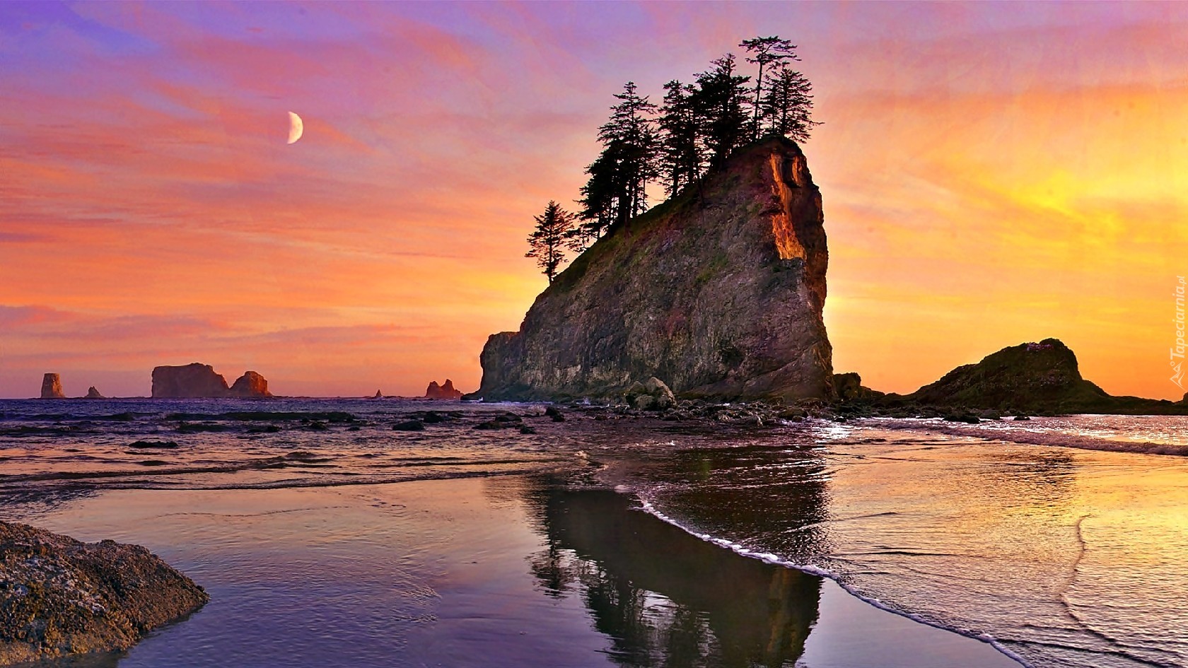 Edytor tapety: Morze, Skały, Drzewa, Księżyc, Zachód słońca