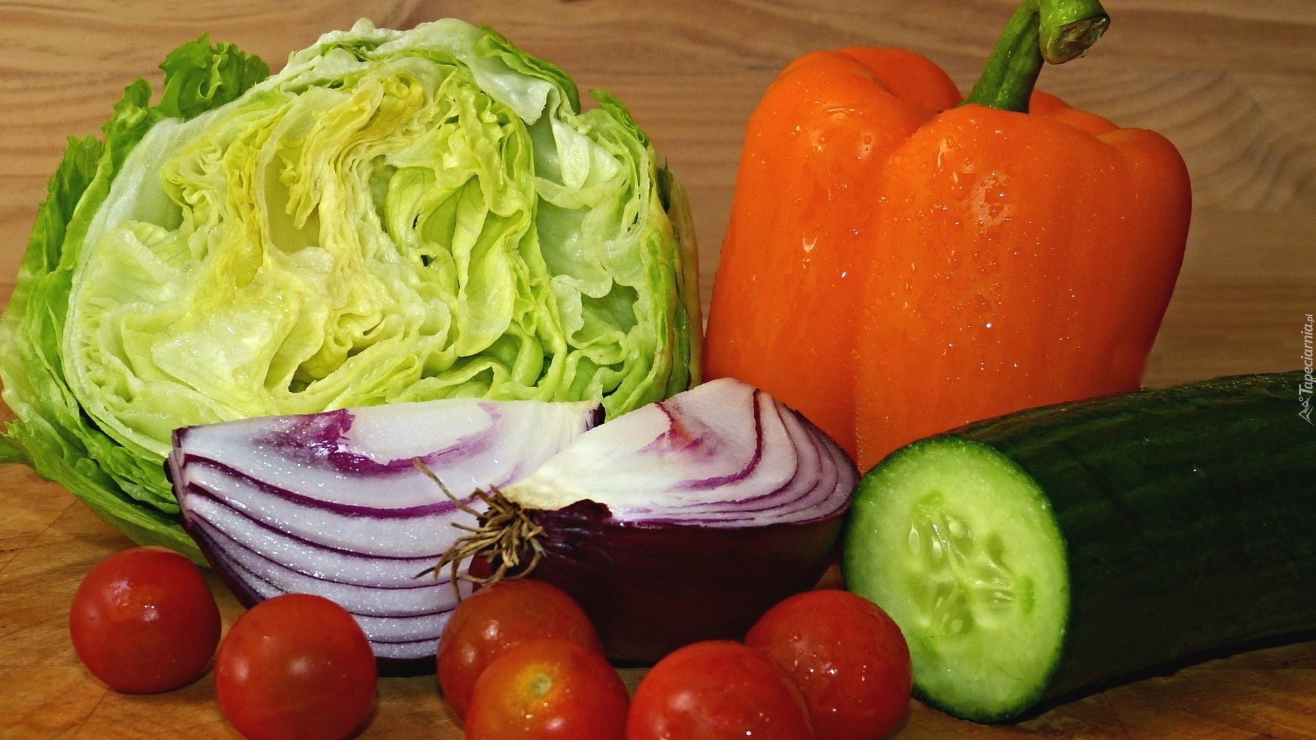 Edytor tapety: Warzywa, Papryka, Ogórek, Pomidory, Sałata, Cebula