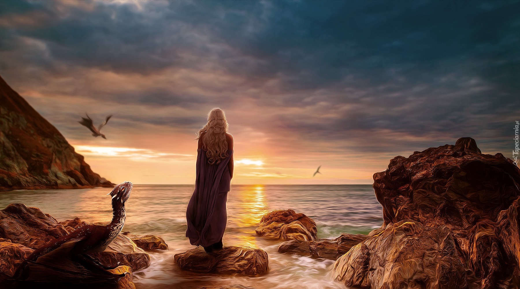 Edytor tapety: Fantasy, Morze, Dziewczyna, Góry, Skały, Ptaki, Smok