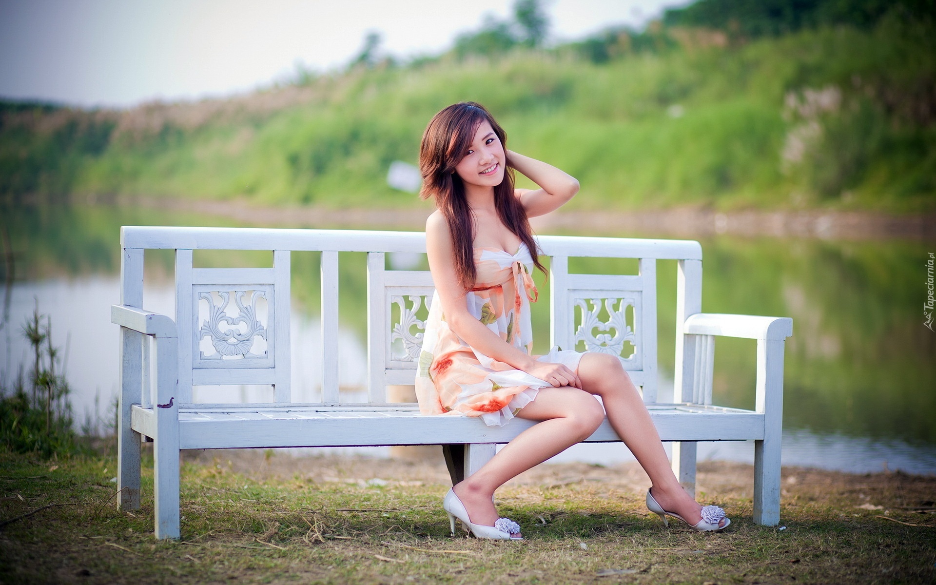 Edytor tapety: Piękna, Kobieta, Biała, Ławeczka