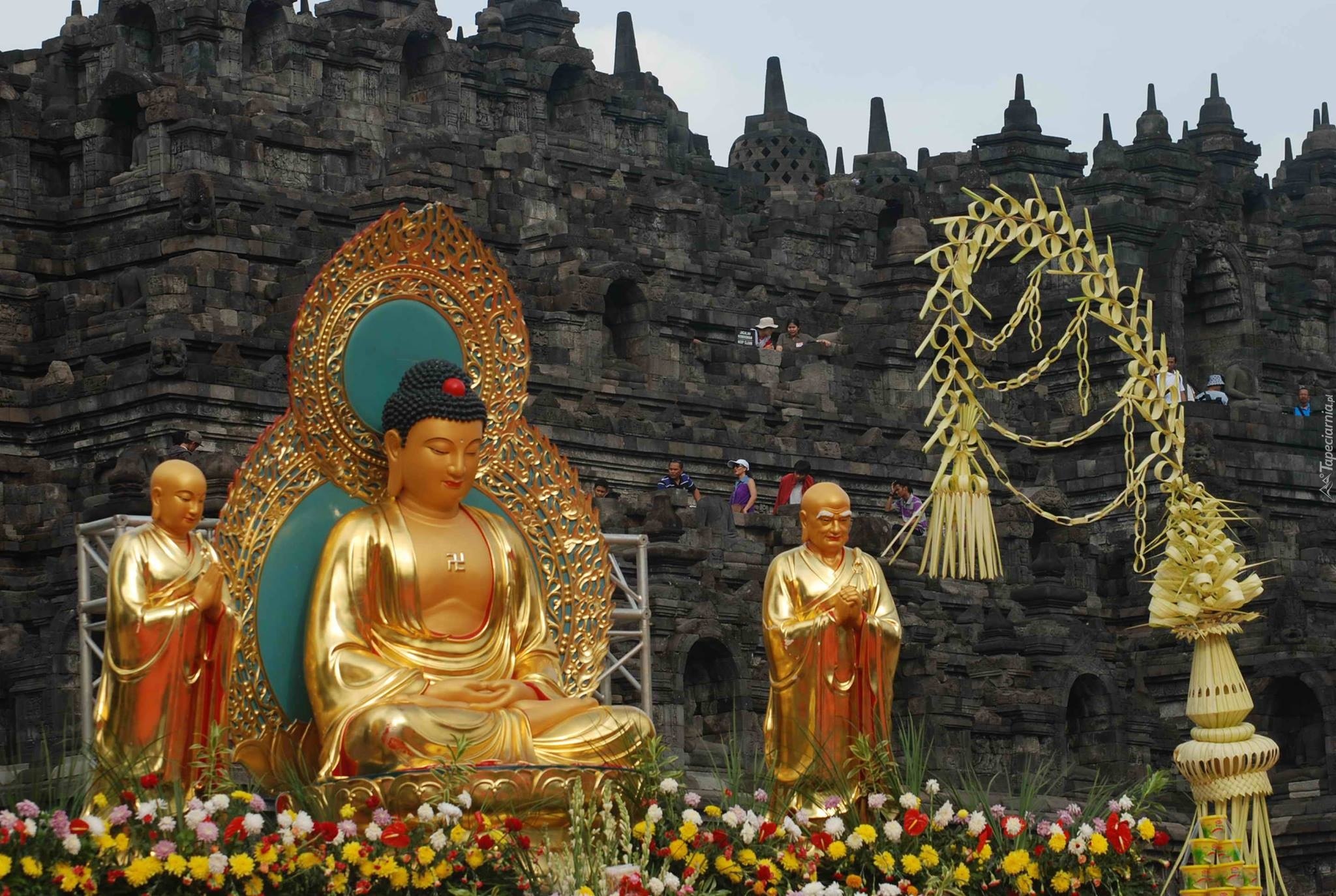 Edytor tapety: Indonezja, Borobudur, Posągi, Ludzie, Kwiaty Pałac