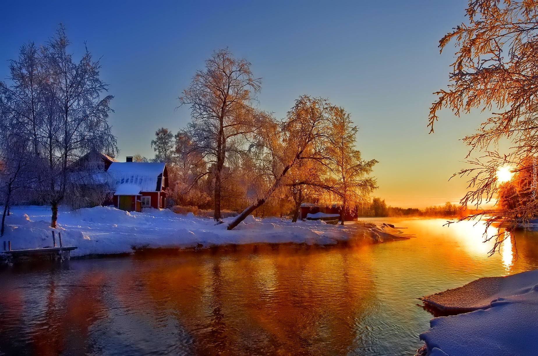 Edytor tapety: Zima, Dom, Rzeka, Zachód słońca