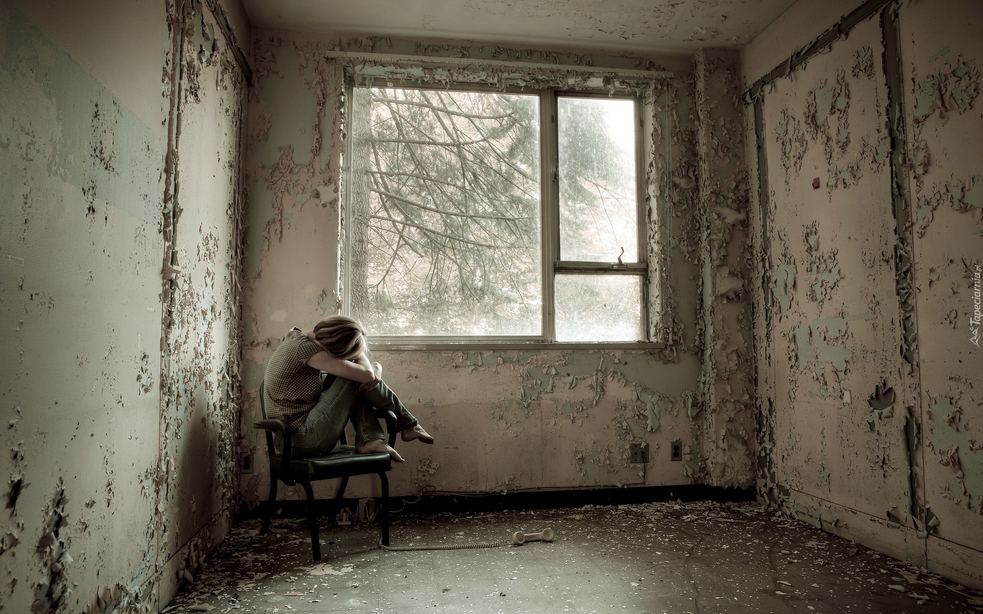 Edytor tapety: Zniszczony, Pokój, Krzesło, Kobieta