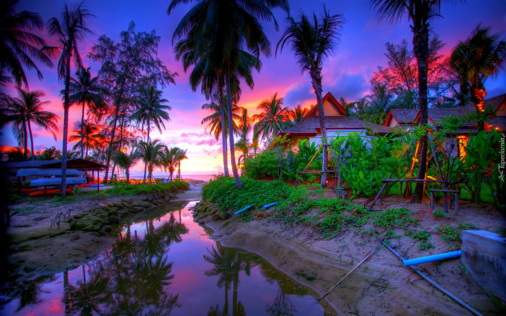Edytor tapety: Wyspa, Palmy, Strumyk, Domki