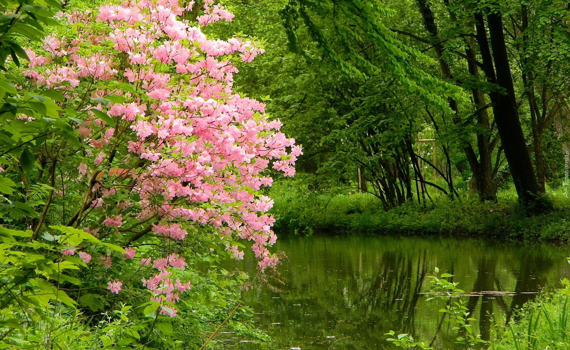 Edytor tapety: Park, Jeziorko, Kwitnący, Krzew