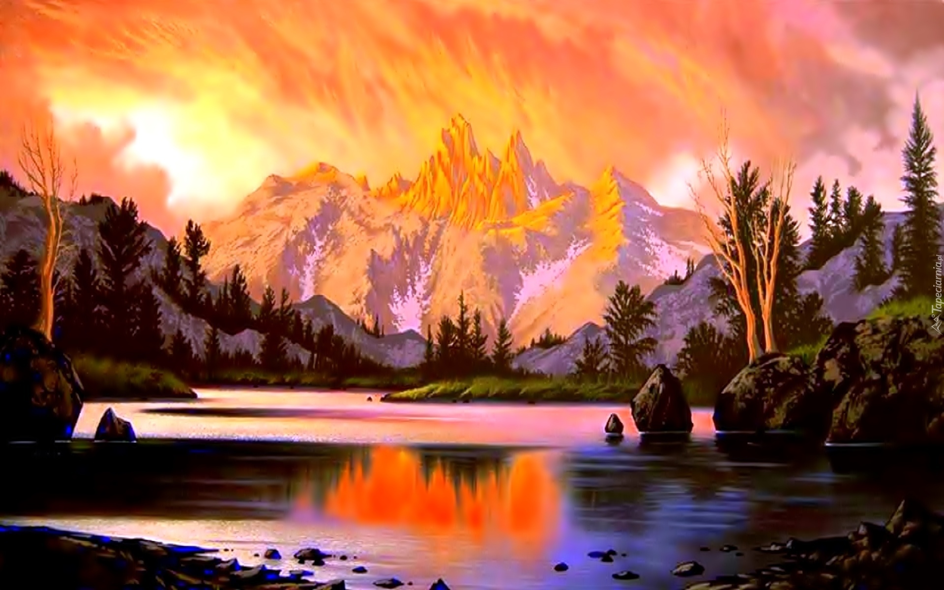 Edytor tapety: Malarstwo, Jezioro, Góry, Drzewa