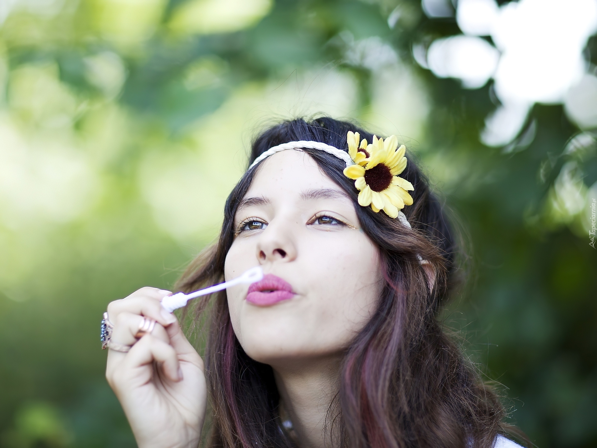 Edytor tapety: Kobieta, Twarz, Opaska, Kwiatek, Mydlane, Bańki