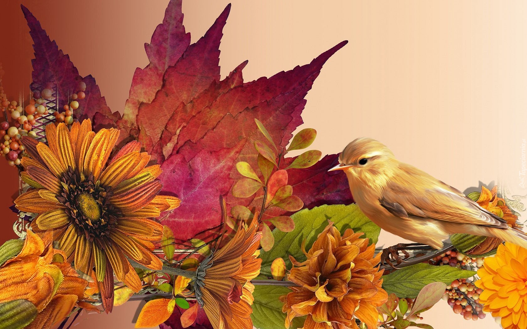 Edytor tapety: Malarstwo, Obraz, Jesienne, Kwiaty, Liście, Kanarek