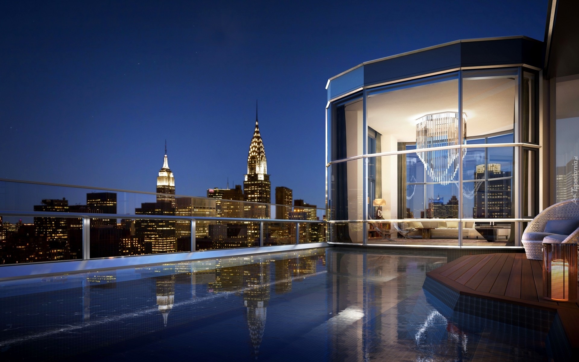 Edytor tapety: Apartament, Taras, Basen, Miasto nocą