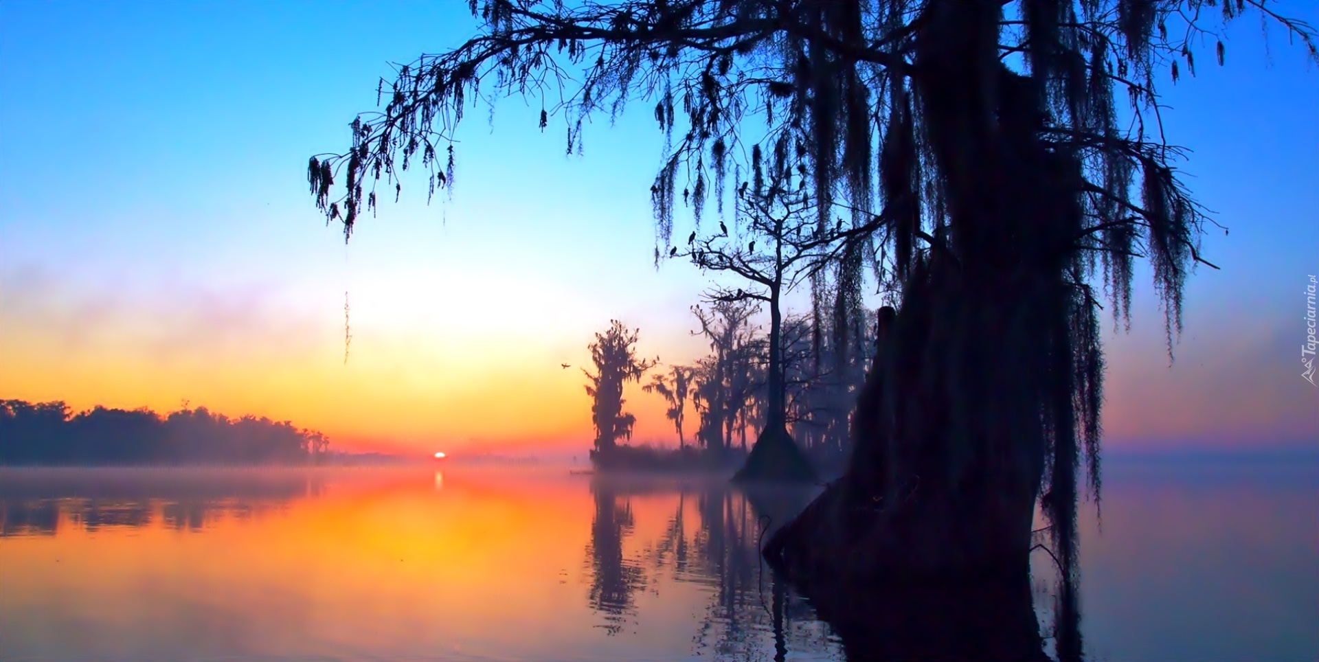 Edytor tapety: Zachód, Słońca, Jezioro, Drzewa