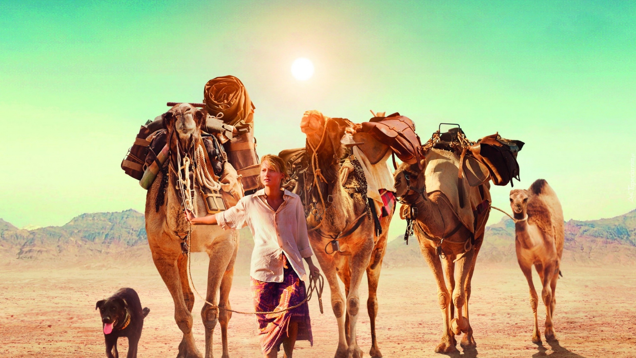 Edytor tapety: Pustynia, Słońce, Wielbłądy, Pies, Kobieta