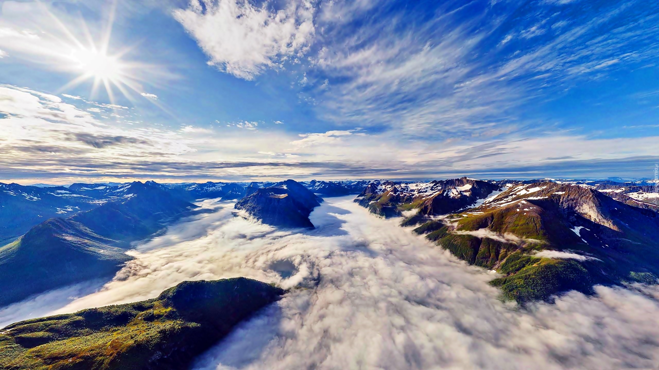 Edytor tapety: Góry, Chmury, Promienie, Słońca, Nad Fiordami, Z lotu ptaka