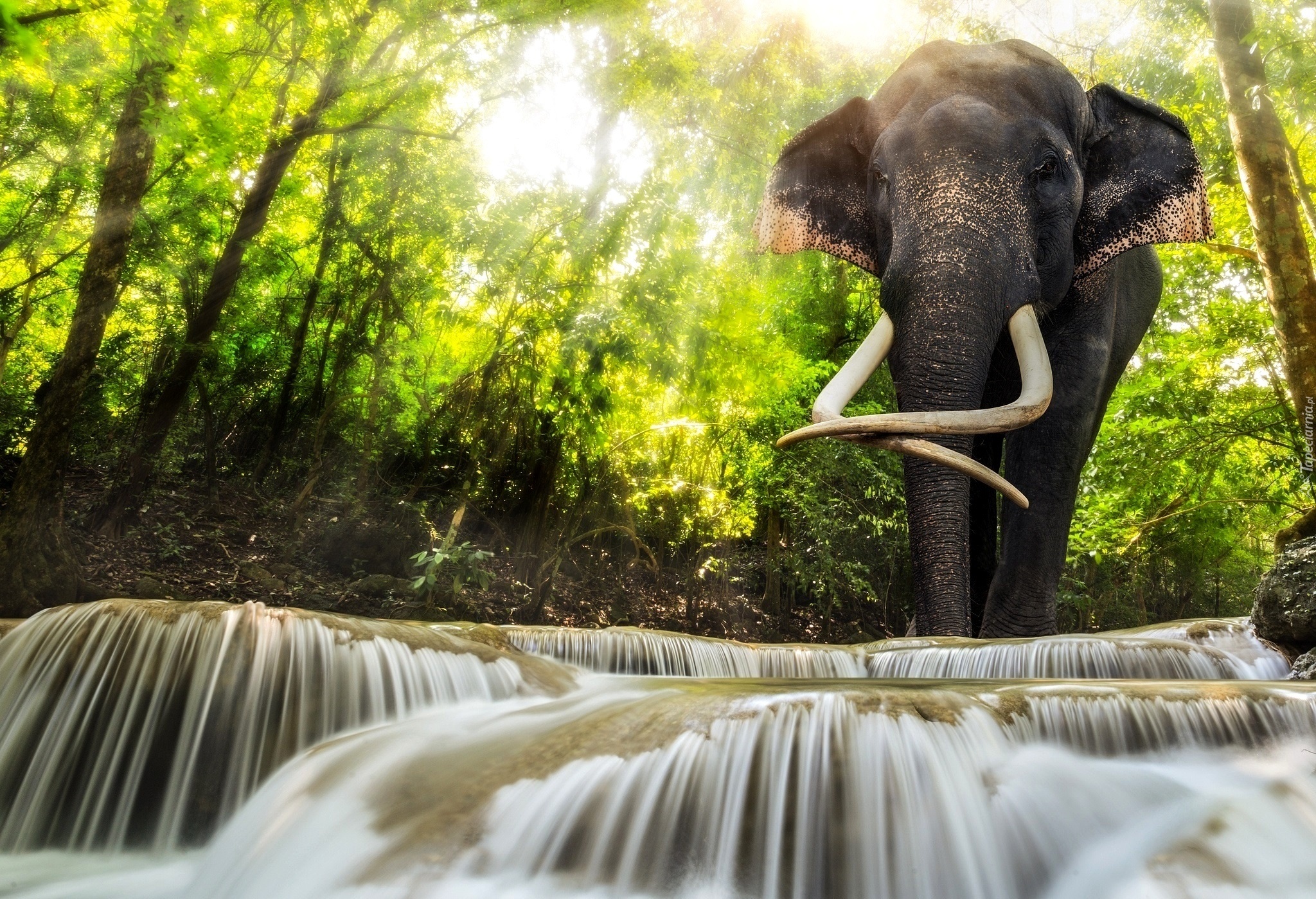 Edytor tapety: Słoń, Las, Przebijające Światło, Rwąca Rzeka