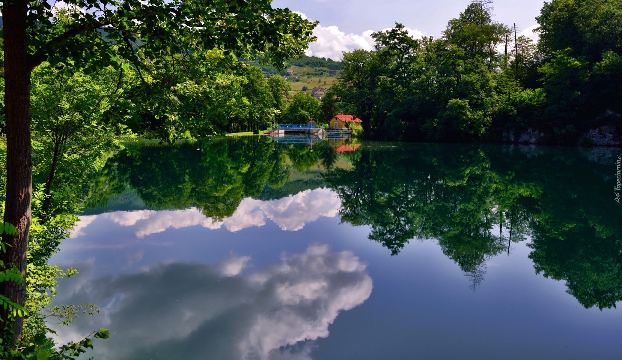 Edytor tapety: Lato, Jezioro, Domek, Drzewa, Odbicie