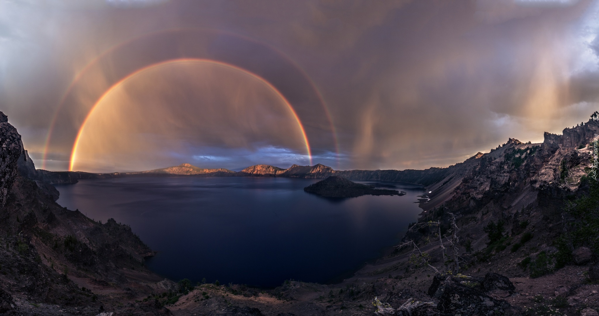 Edytor tapety: Jezioro, Gory, Tecza, Chmury