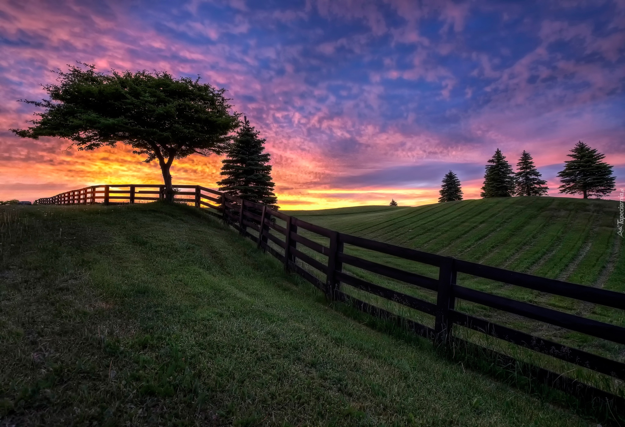 Edytor tapety: Zachód, Słońca, Pola, Uprawne, Płot, Drzewo