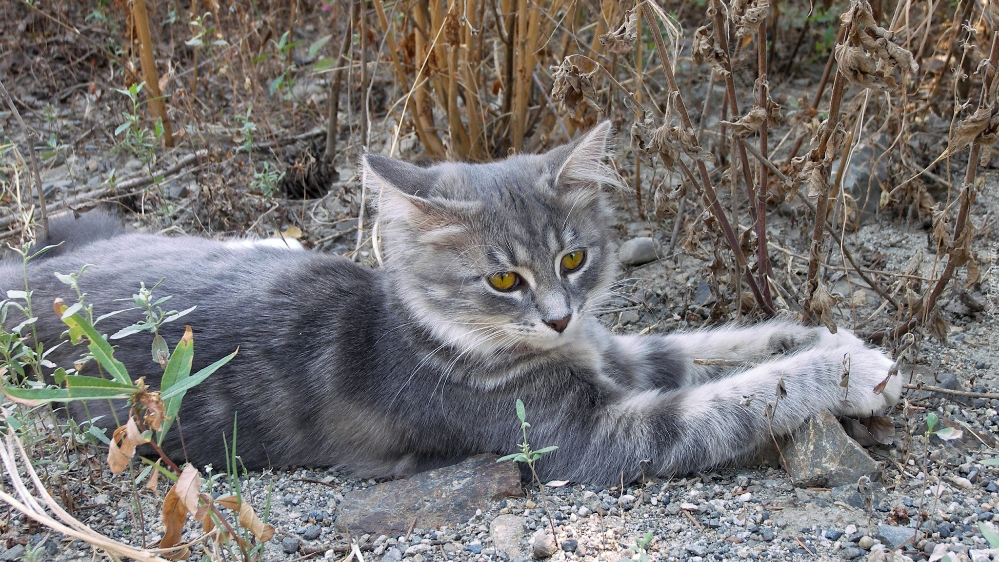 Edytor tapety: Leżący, Szary, Kot, Suche, Rośliny