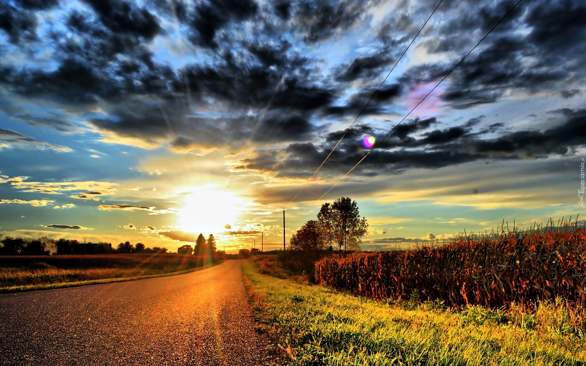 Edytor tapety: Chmury, Droga, Pola, Zachód słońca
