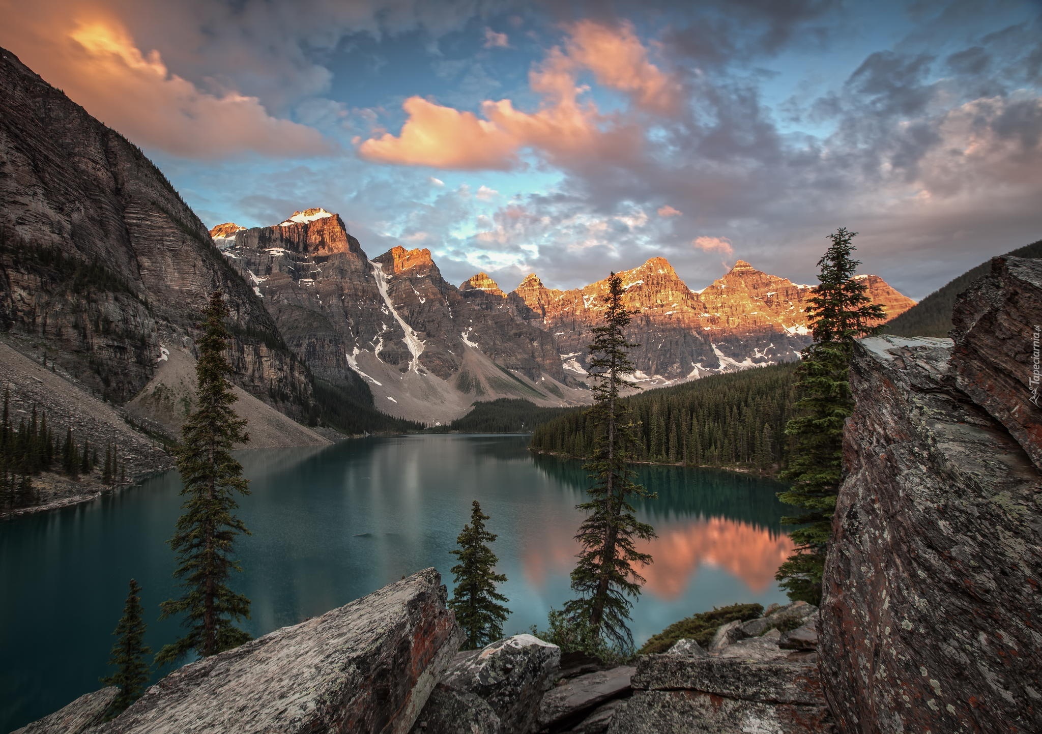 Edytor tapety: Zachod, Slonca, Niebo, Lasy, Jezioro, Gory, Chmury