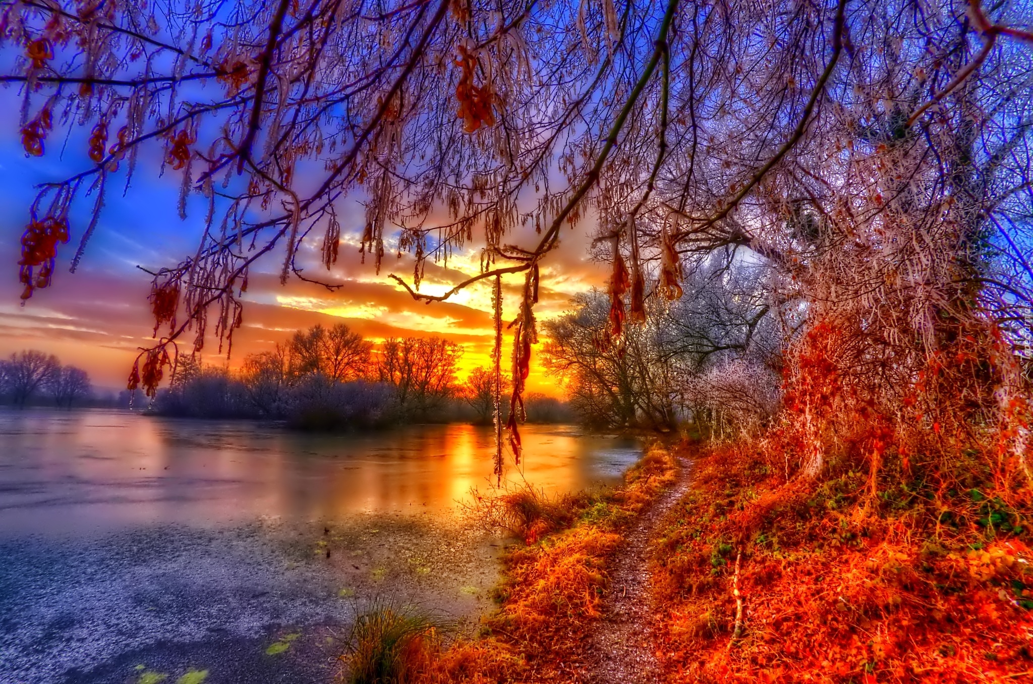 Edytor tapety: Niebo, Chmury, Zachod, Jesien, Slonca,Jezioro, Drzewa