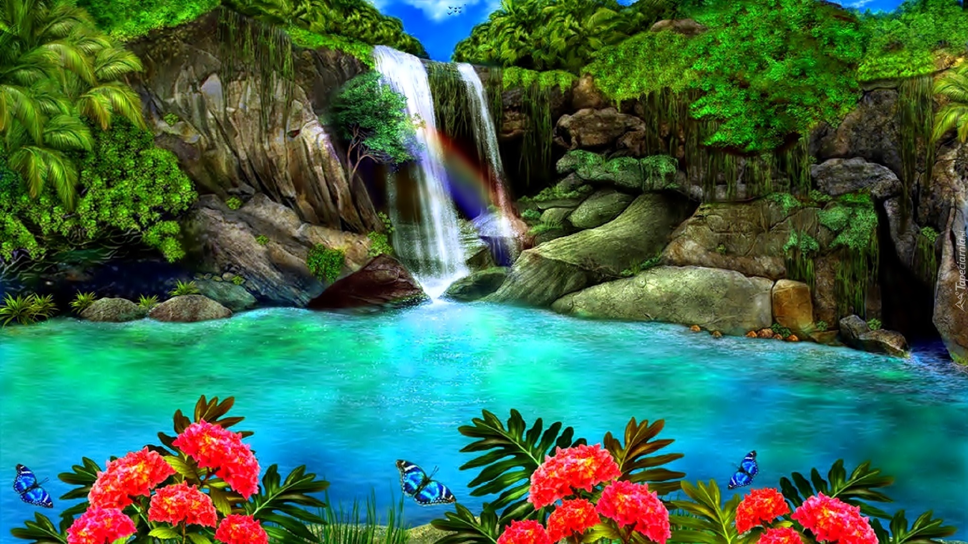 Edytor tapety: Wodospad, Skały, Tęcza, Rośliny, Czerwone, Kwiaty