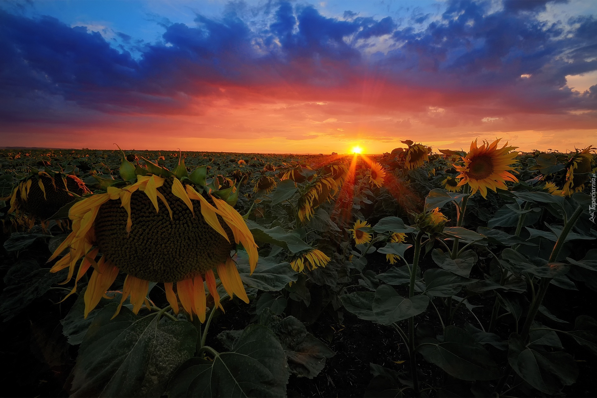 Edytor tapety: Zachod, Slonca, Niebo, Chmury,Sloneczniki