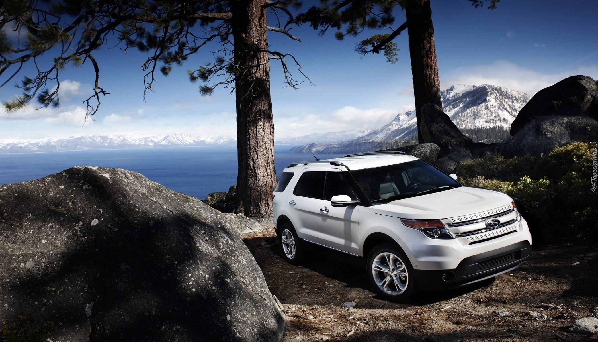 Edytor tapety: Góry, Jezioro, Kamienie, Biały Ford 2011 Explorer