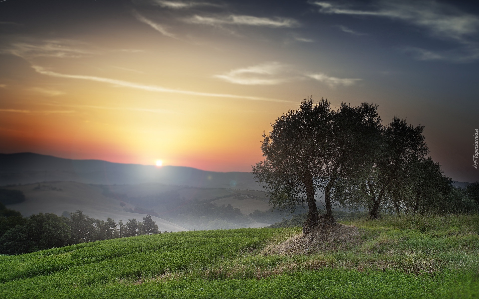 Edytor tapety: Niebo, Chmury, Zachod, Slonca, Drzewo, Laka