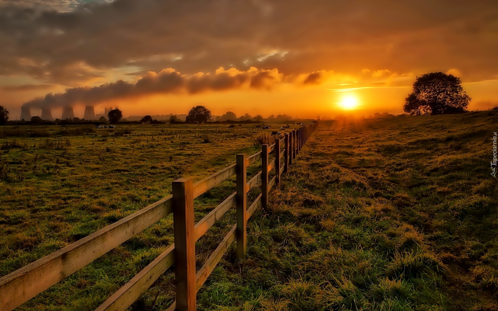 Edytor tapety: Zachód, Słońca, Łąka, Ogrodzenie, Drzewo