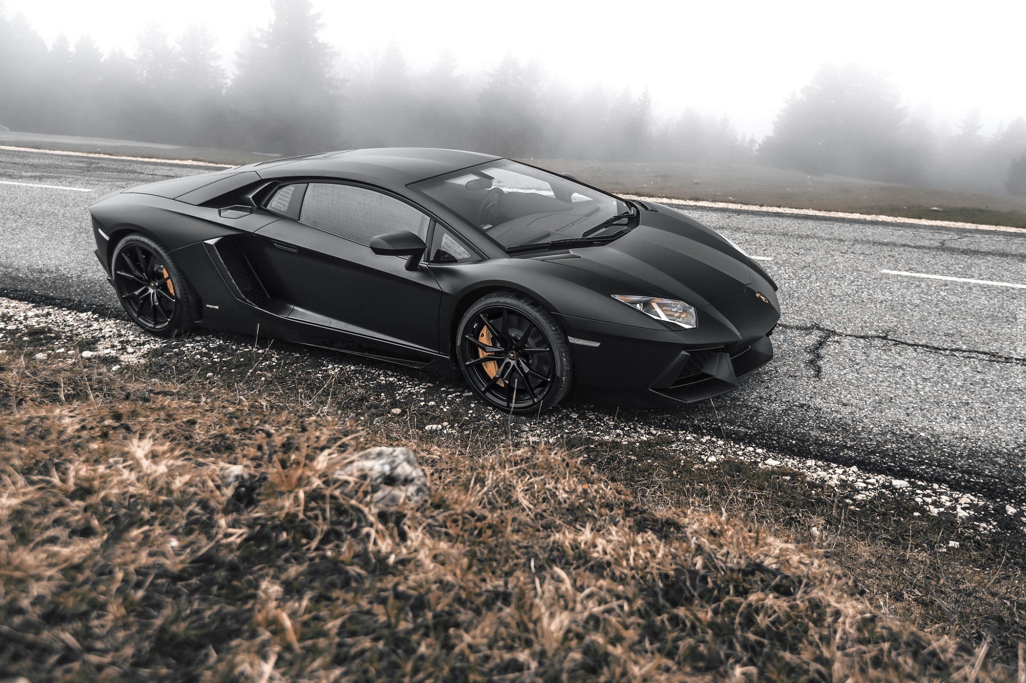 Edytor tapety: Lamborghini, Adventador, Droga, Drzewa, Mgła