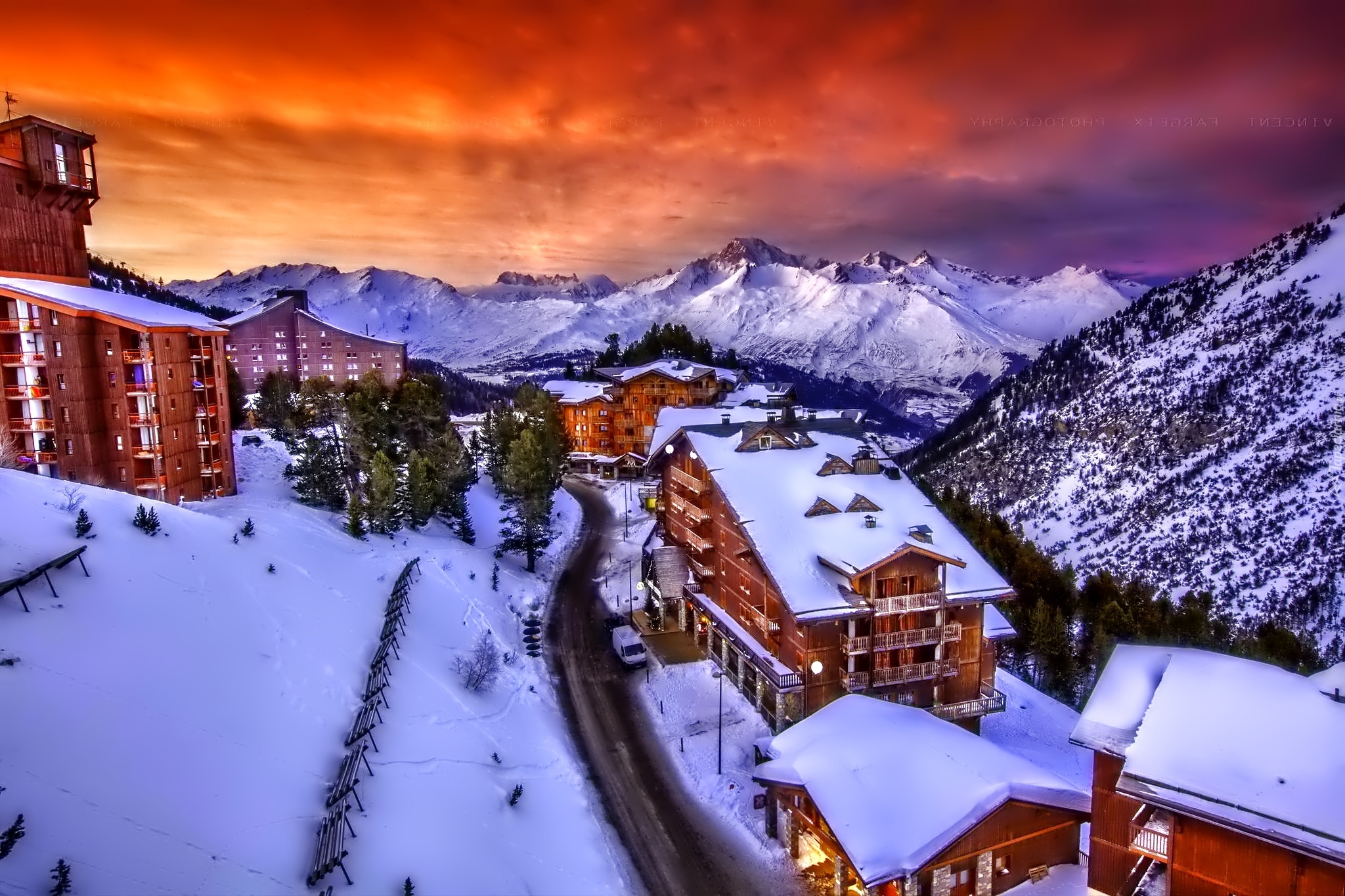 Edytor tapety: Miasteczko, Góry, Droga, Zima