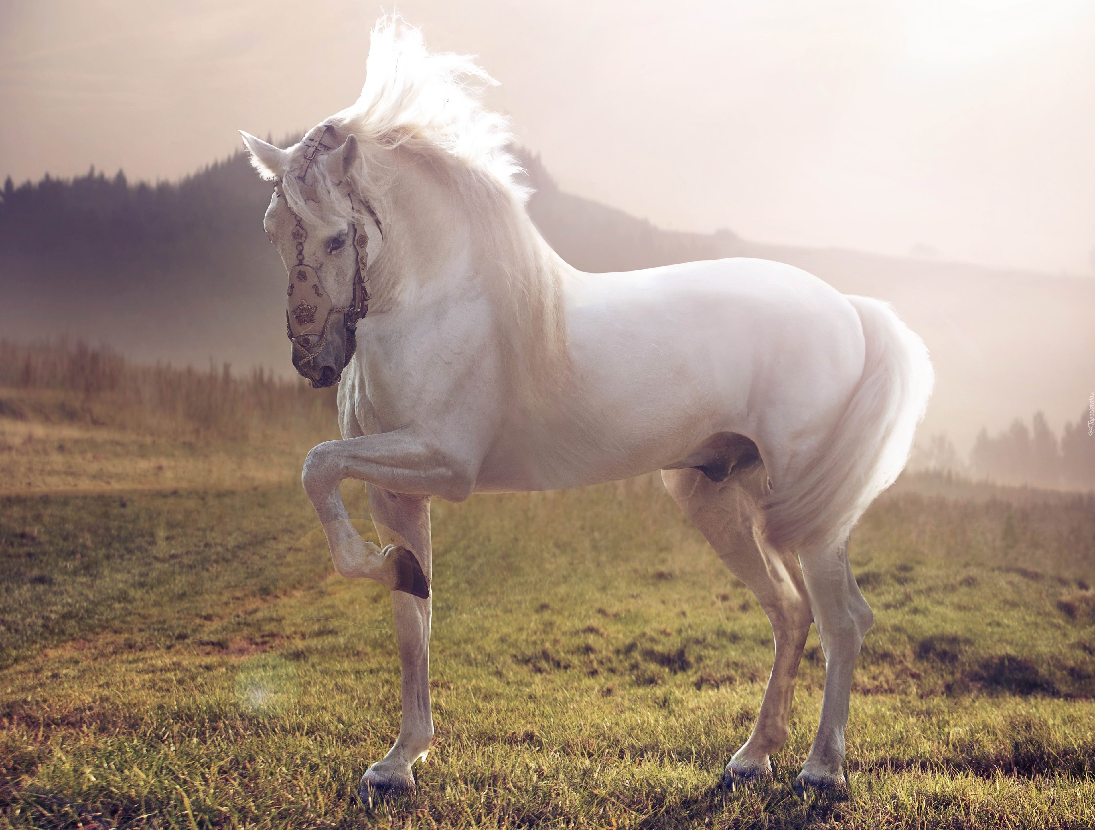 Edytor tapety: Biały Koń, Łąka, Mgła, Świt
