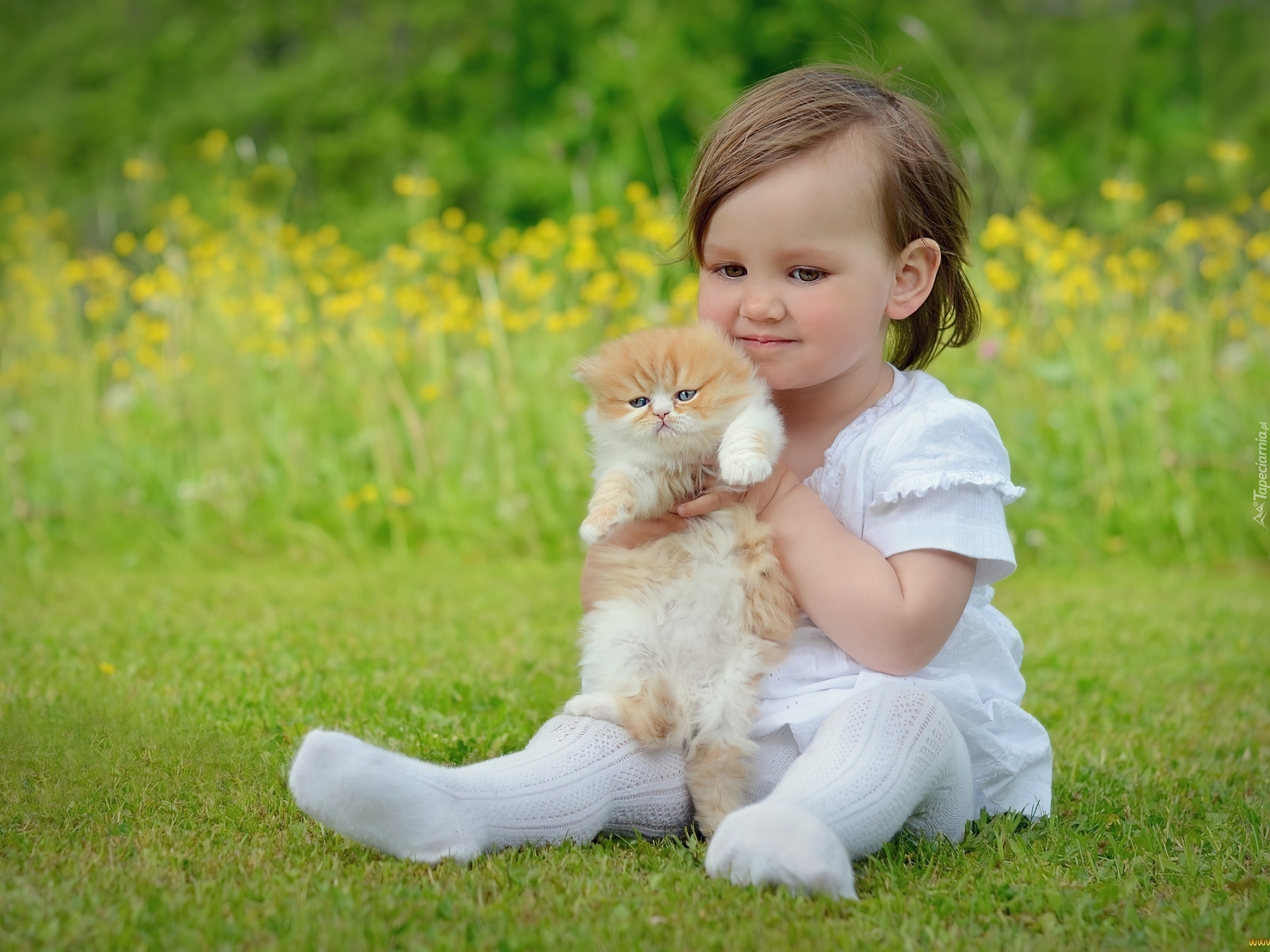 Edytor tapety: Dziecko, Dziewczynka, Łąka, Trawa, Kotek