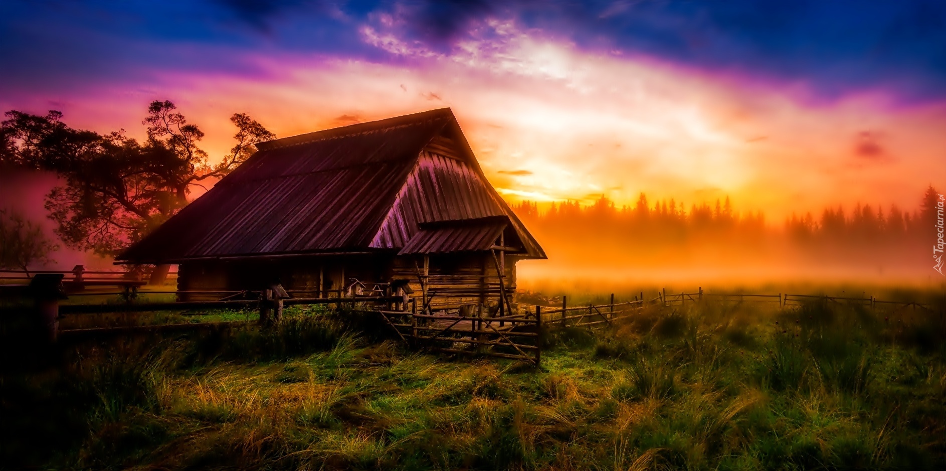 Edytor tapety: Zachód, Słońca, Mgła, Ogrodzenie, Dom, Trawa
