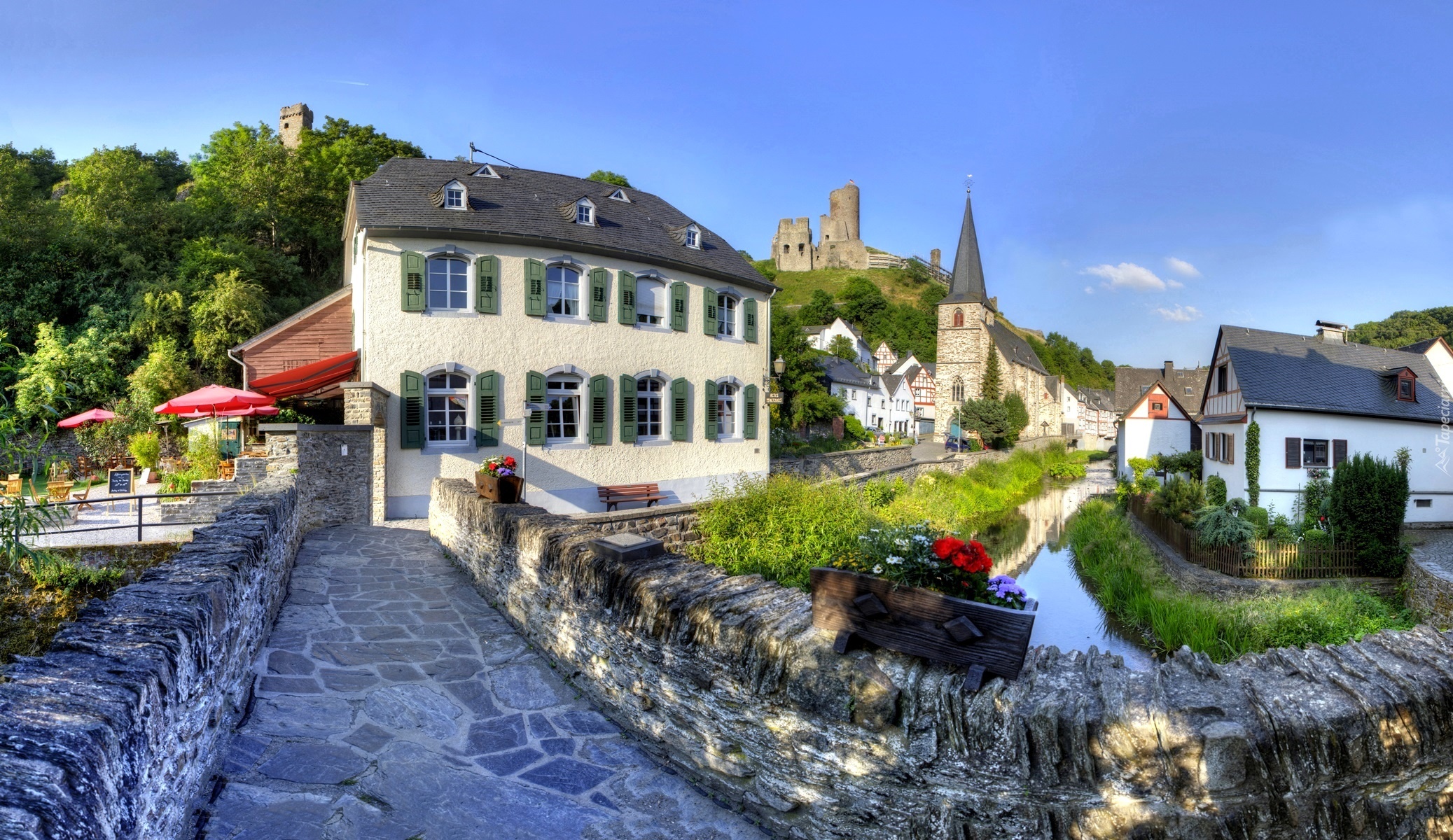 Edytor tapety: Domy, Kamienny Mostek, Ruiny Zamku, Wzgórza, Niemcy