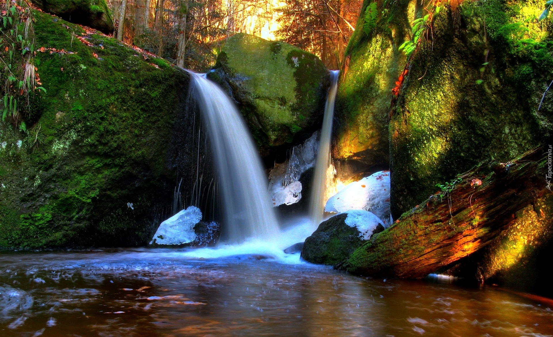Edytor tapety: Las, Głazy, Wodospady, Przebijające Światło