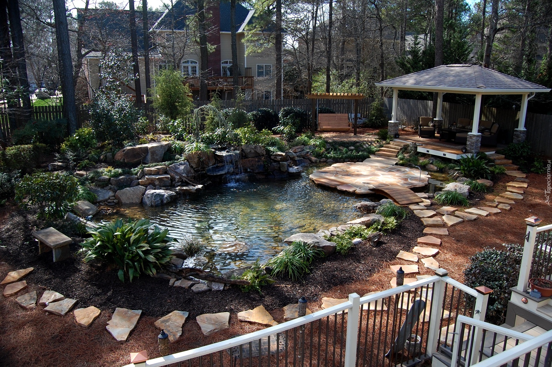 Edytor tapety: Dom, Ogród, Sadzawka, Altana, Drzewa
