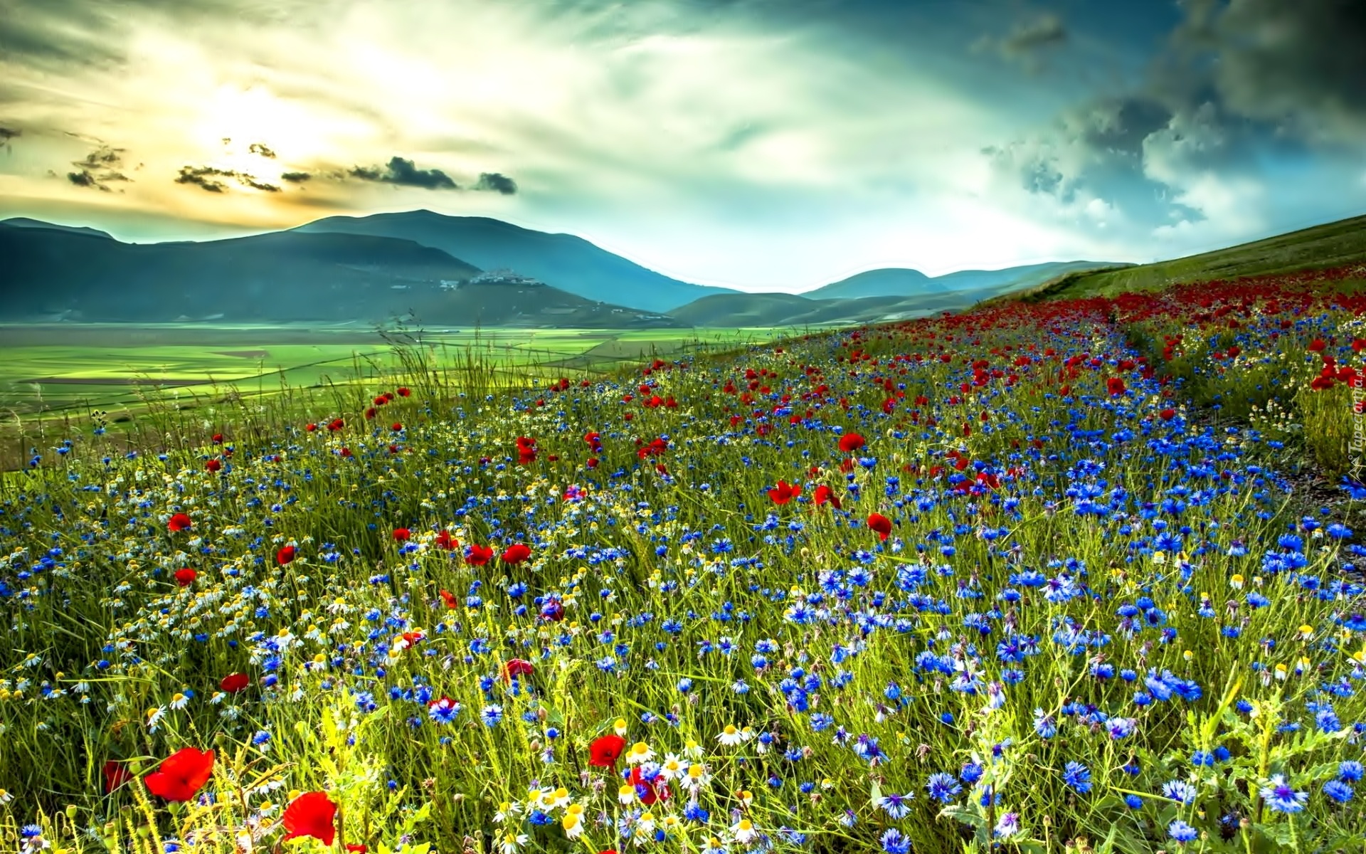 Edytor tapety: Łąka, Góry, Maki, Chabry, Rumianki