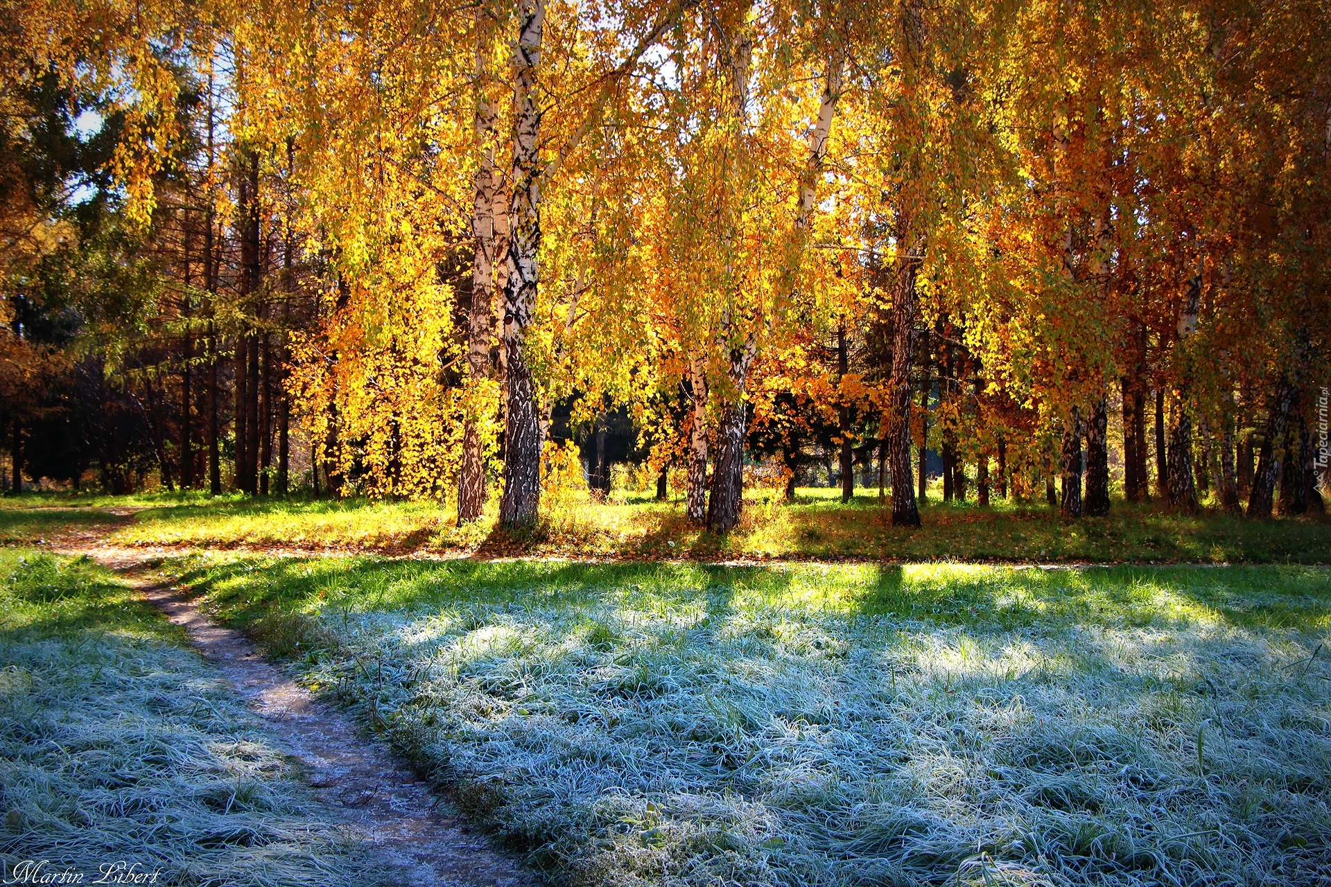 Edytor tapety: Las, Brzozy, Trawa, Szron