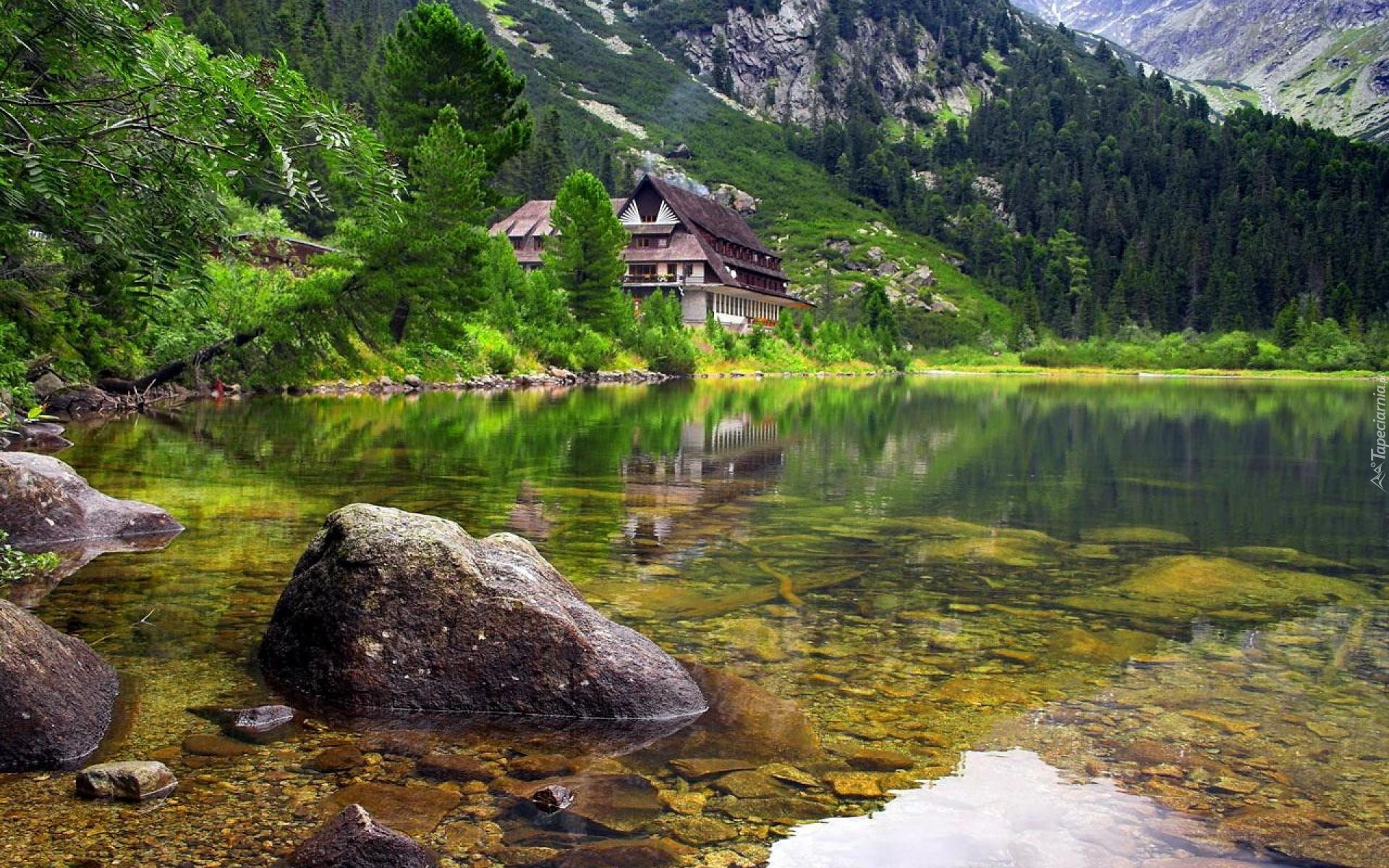 Edytor tapety: Domek, Góry, Las, Jezioro