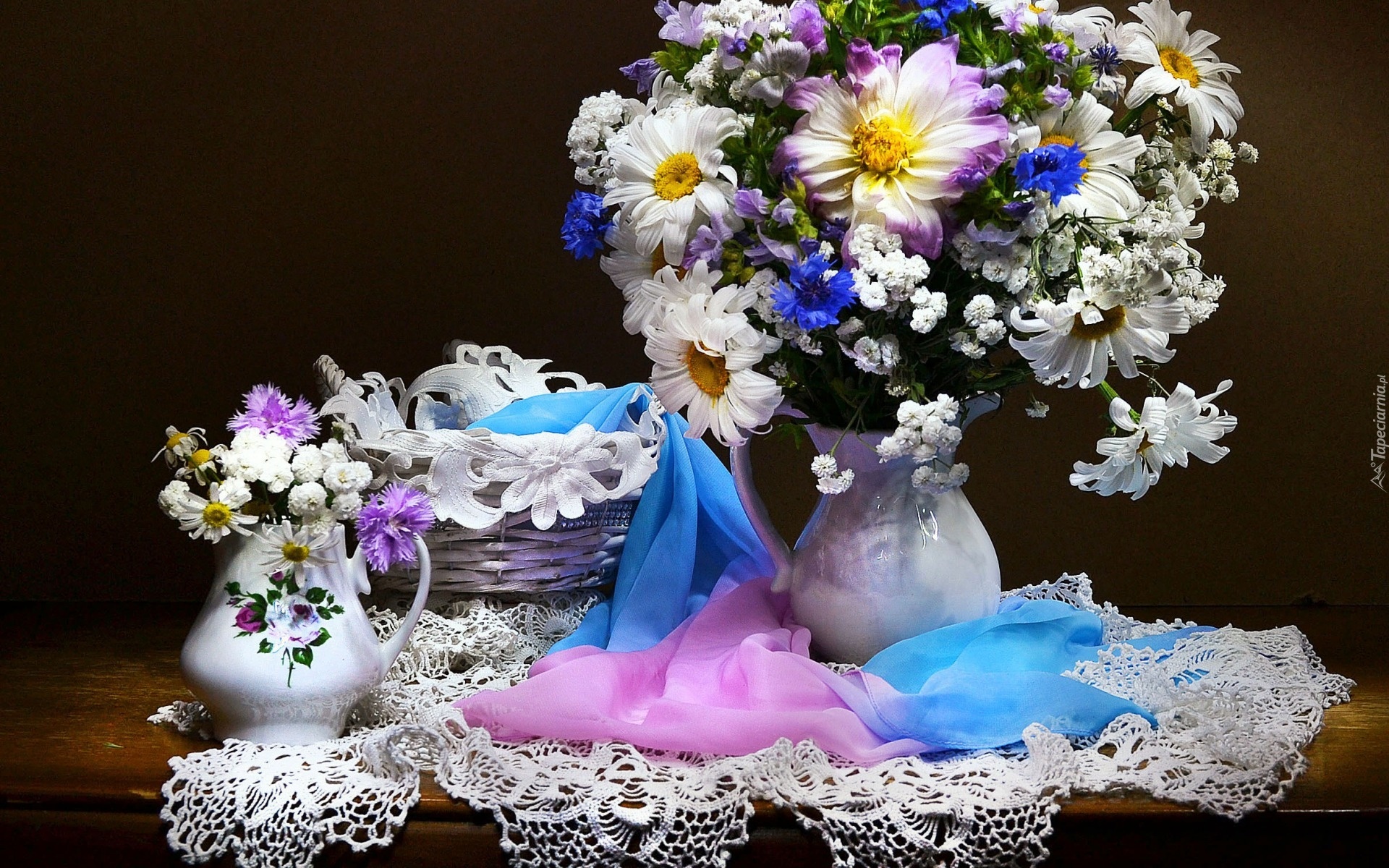 Edytor tapety: Kompozycja, Bukiet, Margarytki, Chabry, Gęsiówka, Serweta