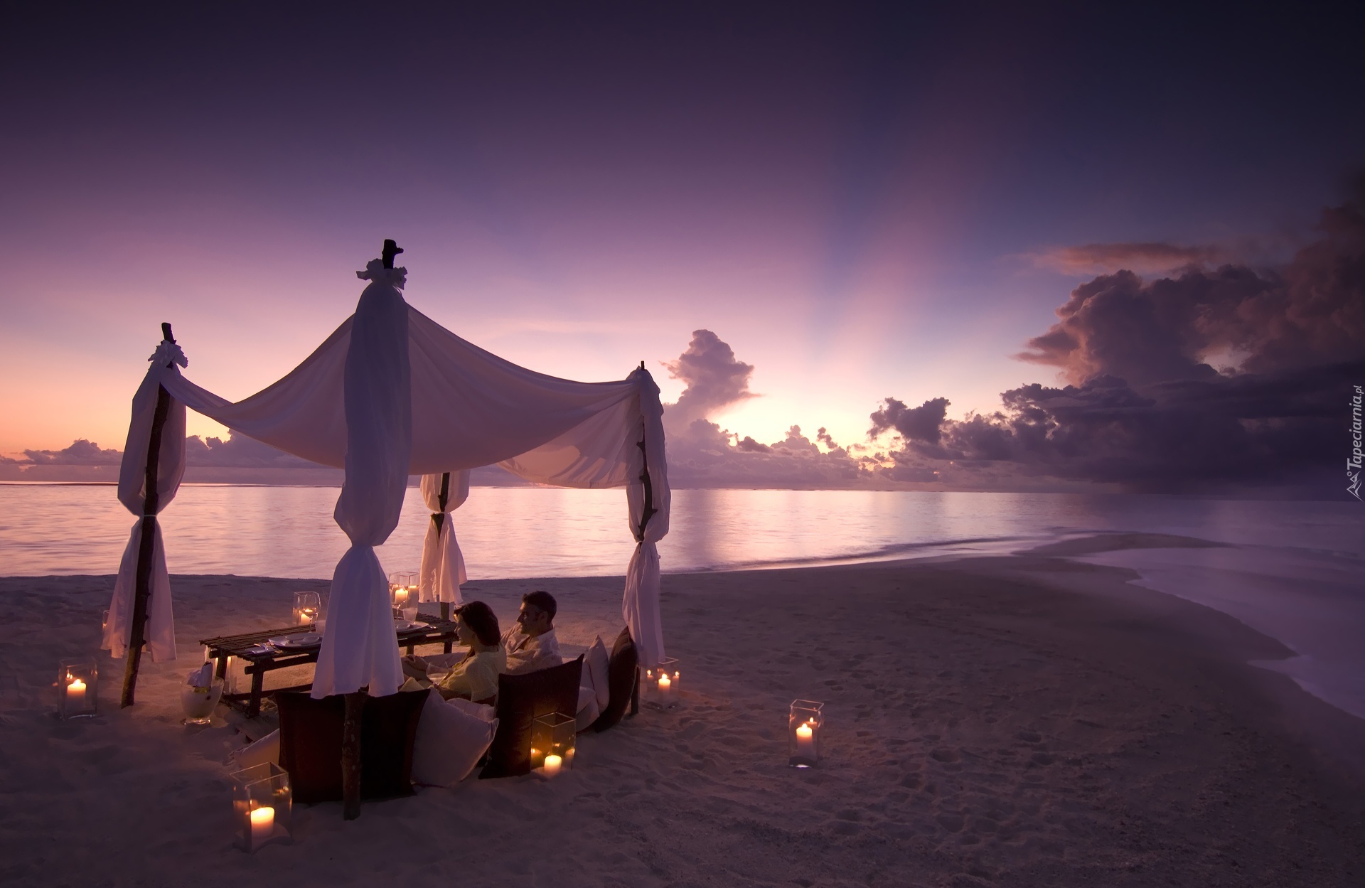 Edytor tapety: Para, Wakacje, Romantycznie, Namiot, Świece, Morze, Plaża, Chmury